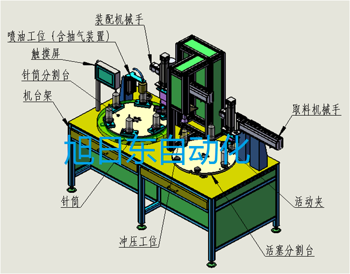 此方案采用了兩臺(tái)360°間歇分割器分別配送針筒及活塞到指定位置再機(jī)械手自動(dòng)抓取裝配;途中實(shí)現(xiàn)自動(dòng)夾定位,自動(dòng)噴涂潤(rùn)滑硅油,實(shí)現(xiàn)自動(dòng)松開夾具等功能;裝配完成后采用了機(jī)械手自動(dòng)下件功能。